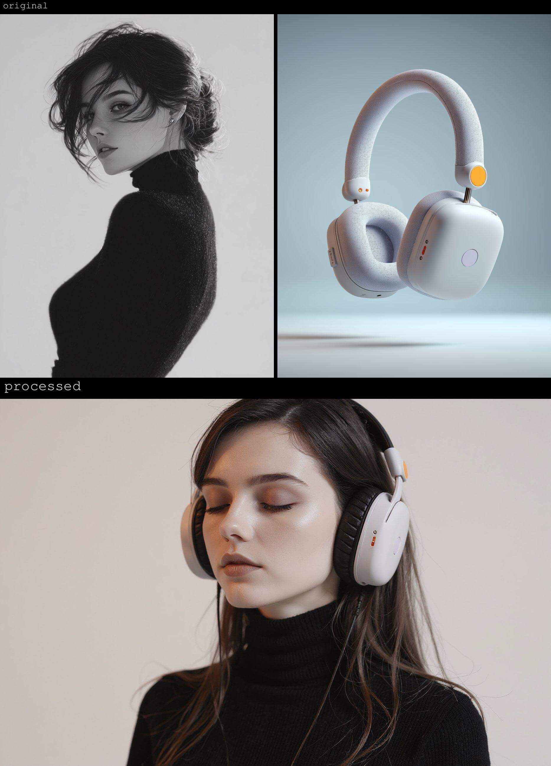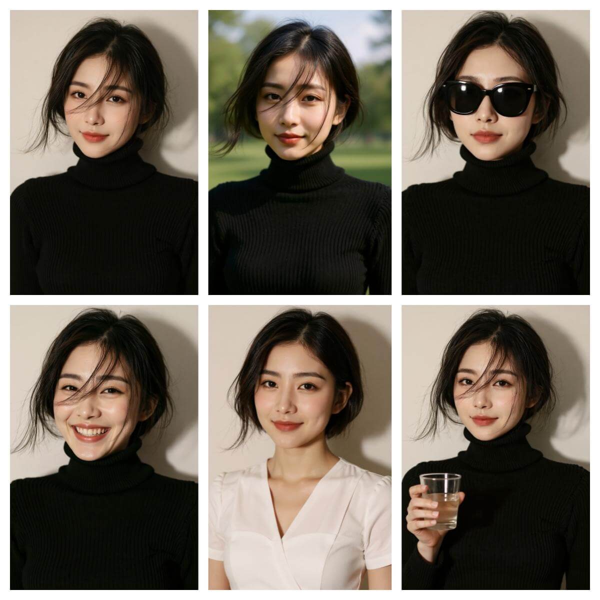 左上为原图,各种增删改几乎是无所不能,修改发型、发色,替换背景,微笑,更换服饰、手拿产品等等。。。并且在修改的过程中保持了极强的一致性