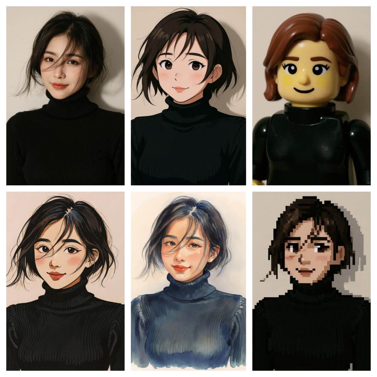 左上为原图、后面依次是吉普力风格、乐高风格、剪纸风格、水彩风格、像素风格,在保持原有构图的情况下很好的实现了多种风格转绘