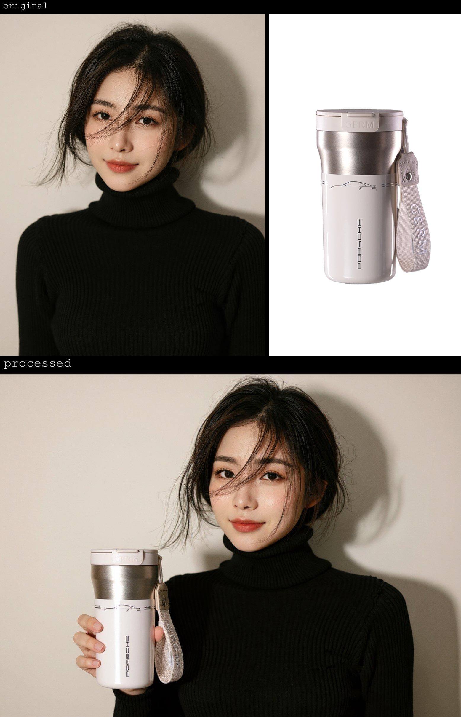 除了对单张图片进行修改外,还上传多张图片(两张、三张甚至更多)给模型参考,可以让模特拿着自家的产品展示、多图元素融合等等,可控性和可玩性都大大增加,真正的生产力工具,并且产品以及人物一致性都保持的很好