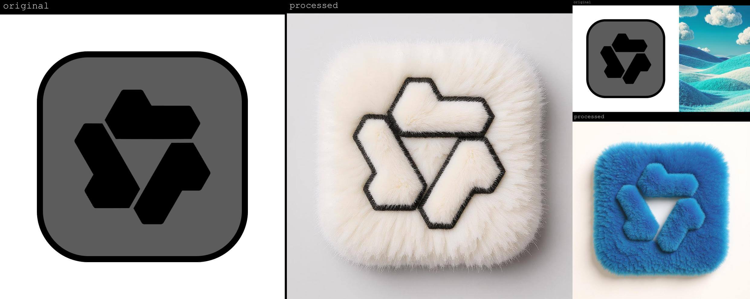 除了进行人物的风格转绘外,还可以对一些 Logo 进行风格化,可以在单图模型下通过提示词的形式、也可以在双图模式下参考图片风格进行风格化